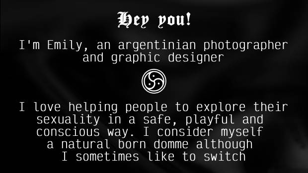As a sub I'm very, very obedient and kinky. As a dom, well... I'm pretty versatile. I can be a bitch or a tender mistress who encourages you to become real your deepest fantasies.