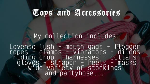 My toy Collection is composed of dildos from different sizes, vibrators, gagball, spidergag, nipple clamps, whip, anal plugs, ropes and Lovense Lush (no need to install app to control it).